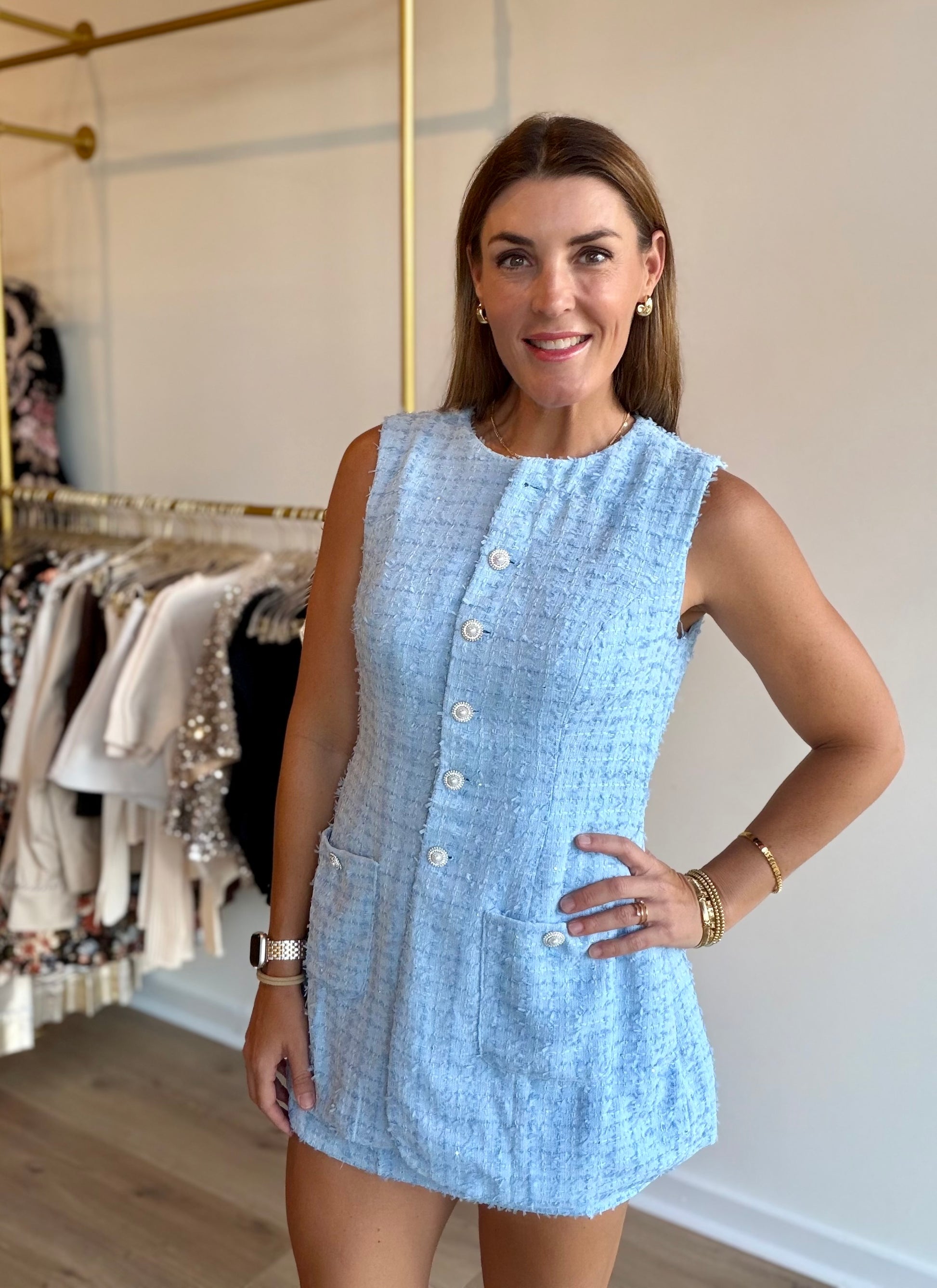 Baby blue tweed mini dress with jeweled buttons and sequin details. Vest style.