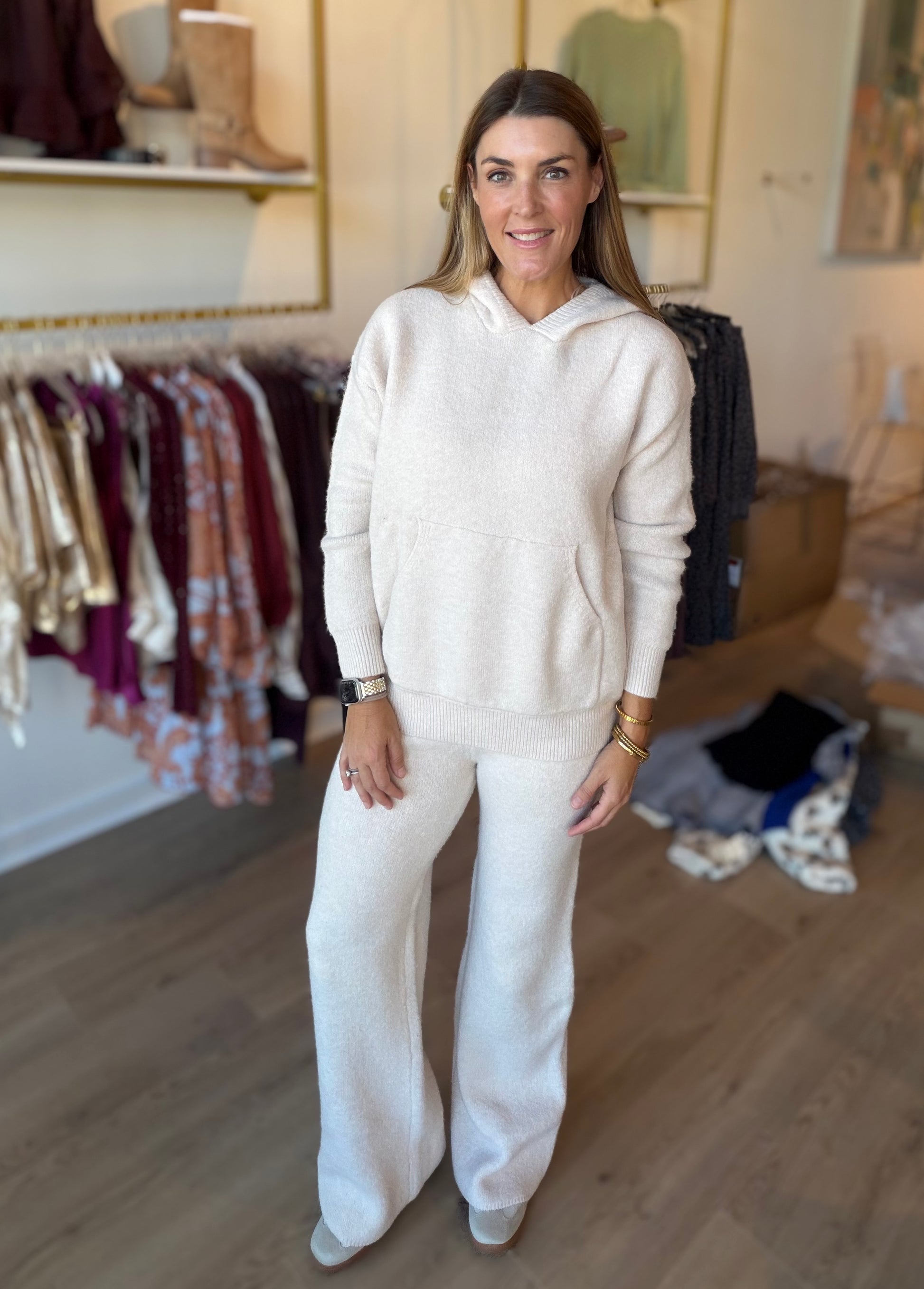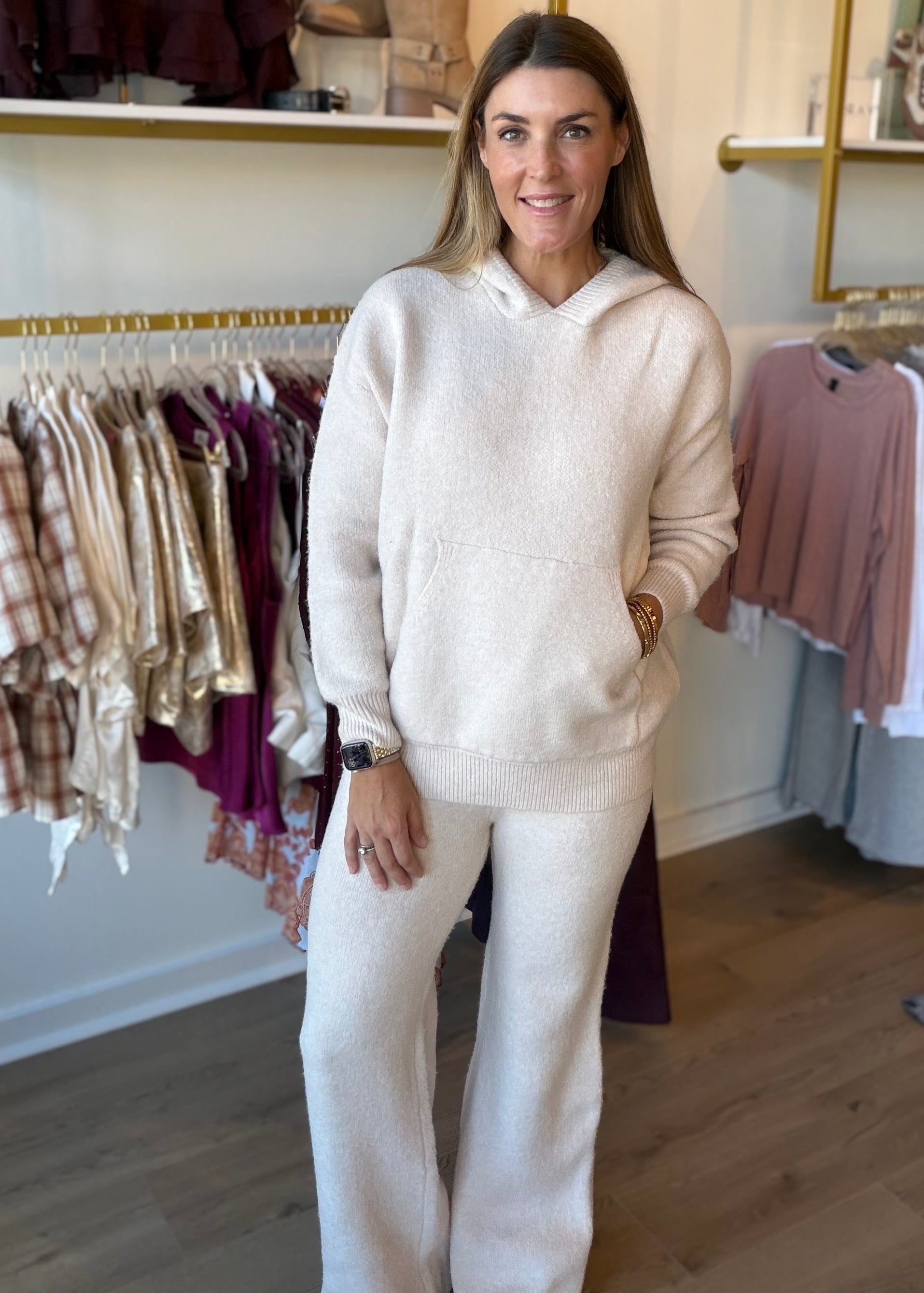 A relaxed-fit knit hoodie designed for ultimate comfort and casual style. Featuring a soft textured knit, kangaroo pocket, ribbed trim, and a cozy hood for laid-back layering.