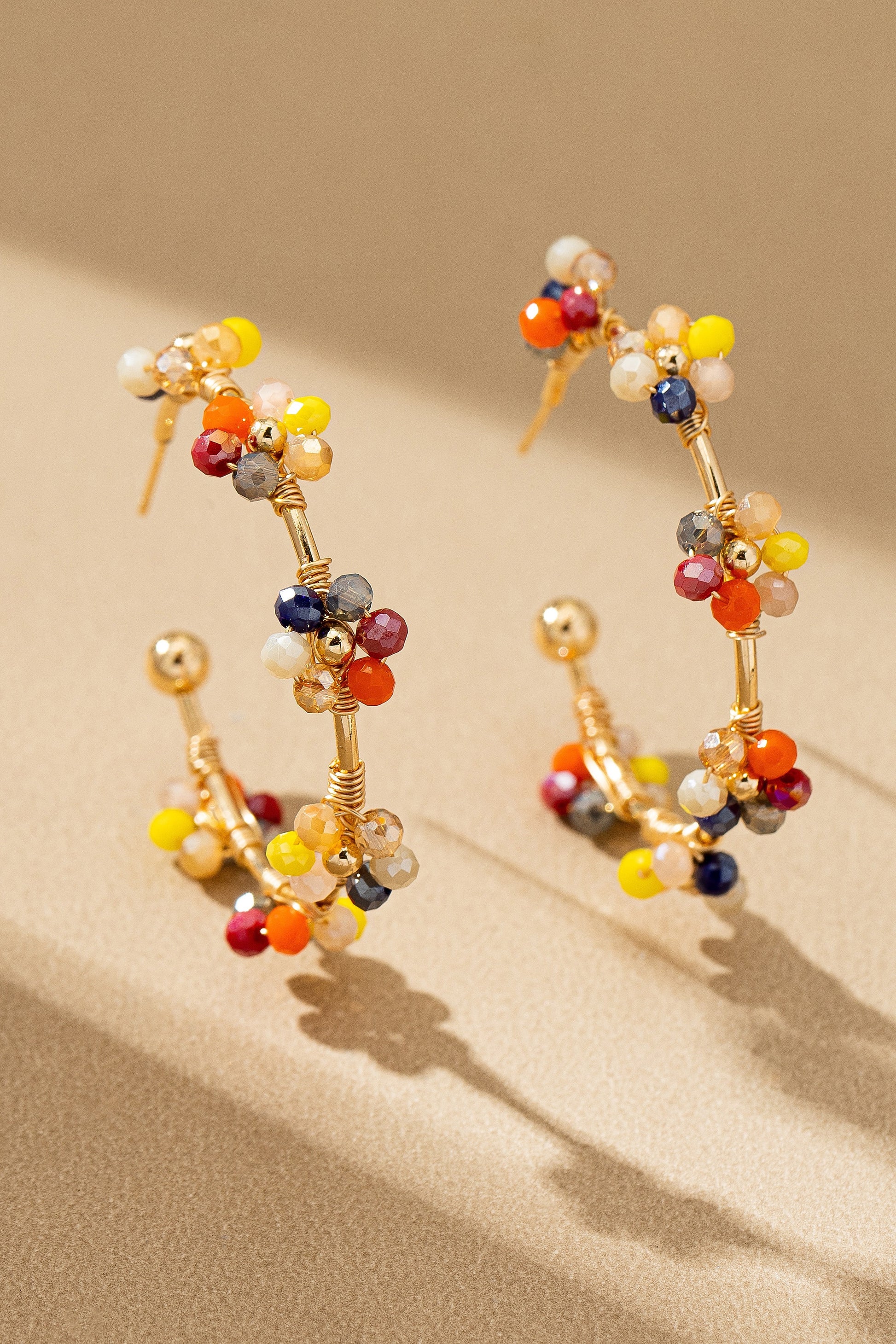BloomPop Beaded Flower Hoop Earrings Whimsical and radiant, these gold-tone hoop earrings are adorned with clusters of tiny beaded flowers, each crafted from faceted glass beads.