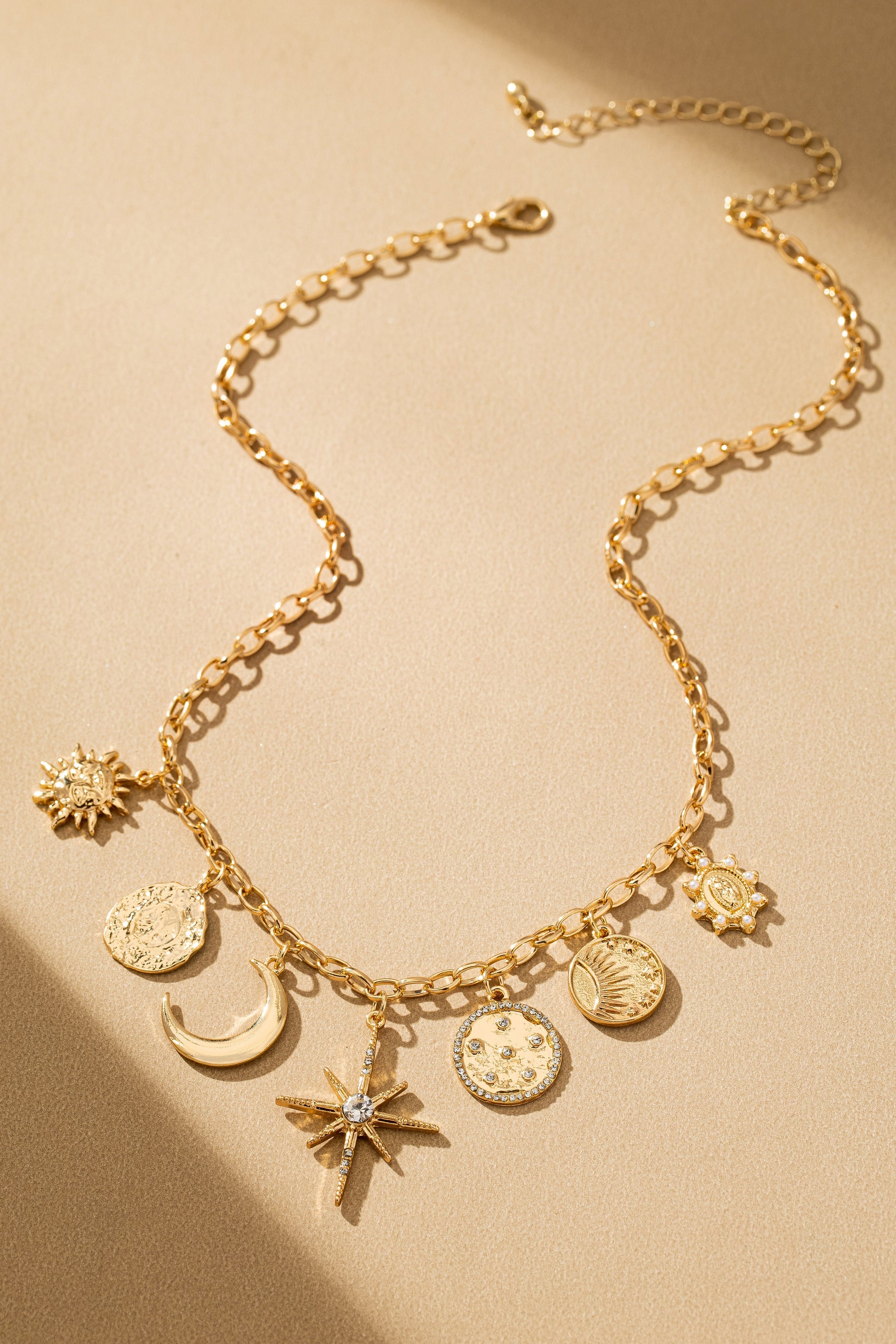 Embrace the magic of the cosmos with this celestial-themed charm necklace. Crafted in a radiant gold tone, the chain features sunbursts, moon phases, zodiac-style medallions, and a brilliant north star centerpiece adorned with a crystal accent. A perfect balance of mysticism and elegance, this piece is designed to light up your neckline.