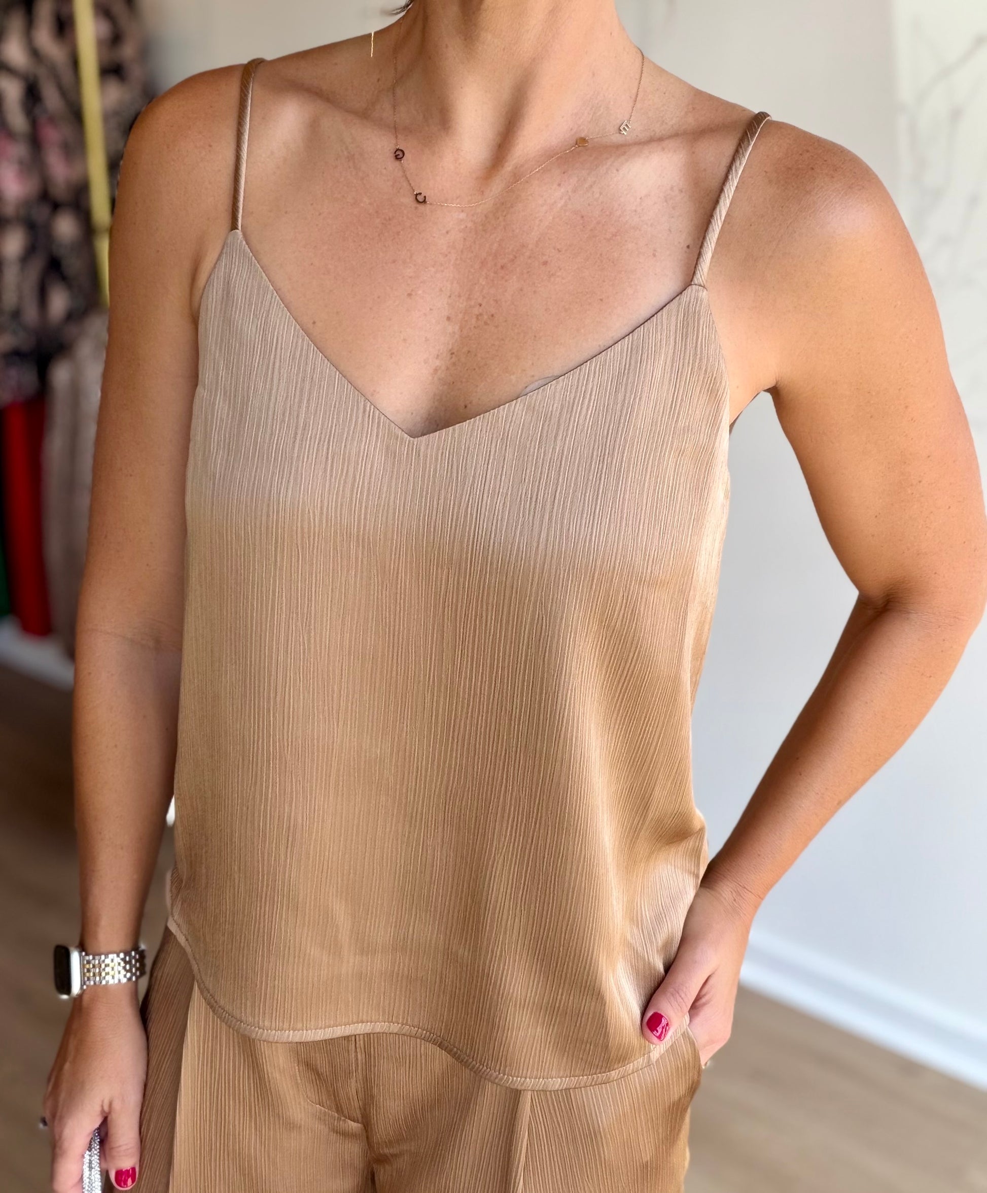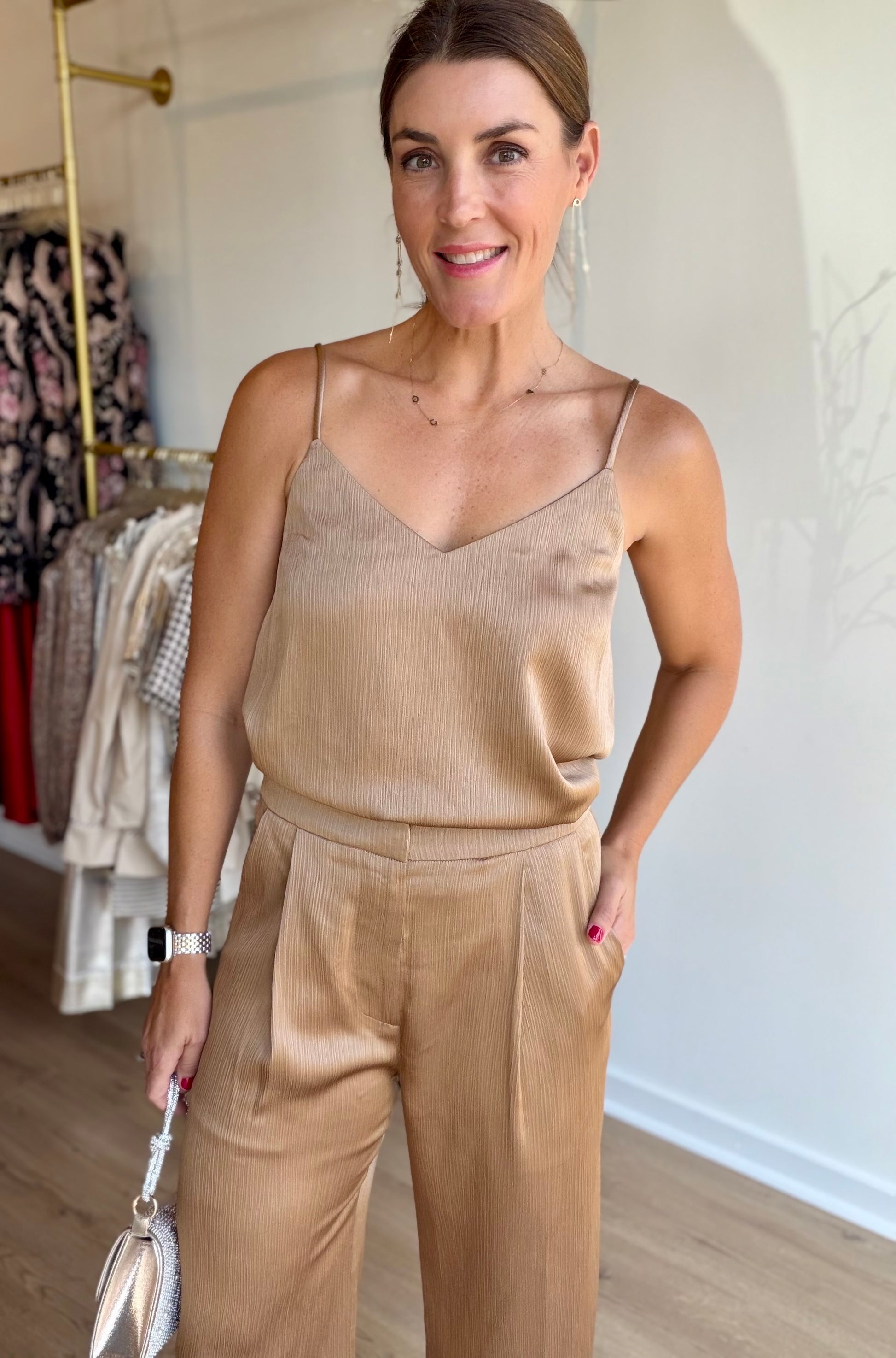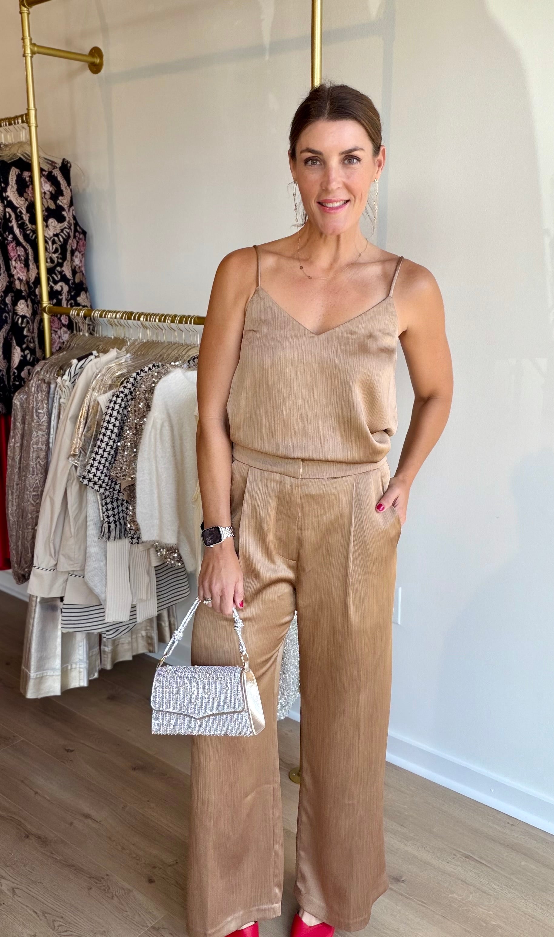 Taupe satin blend blouse with adjustable straps. Perfect matches the textured pant for a monochromatic holiday look.