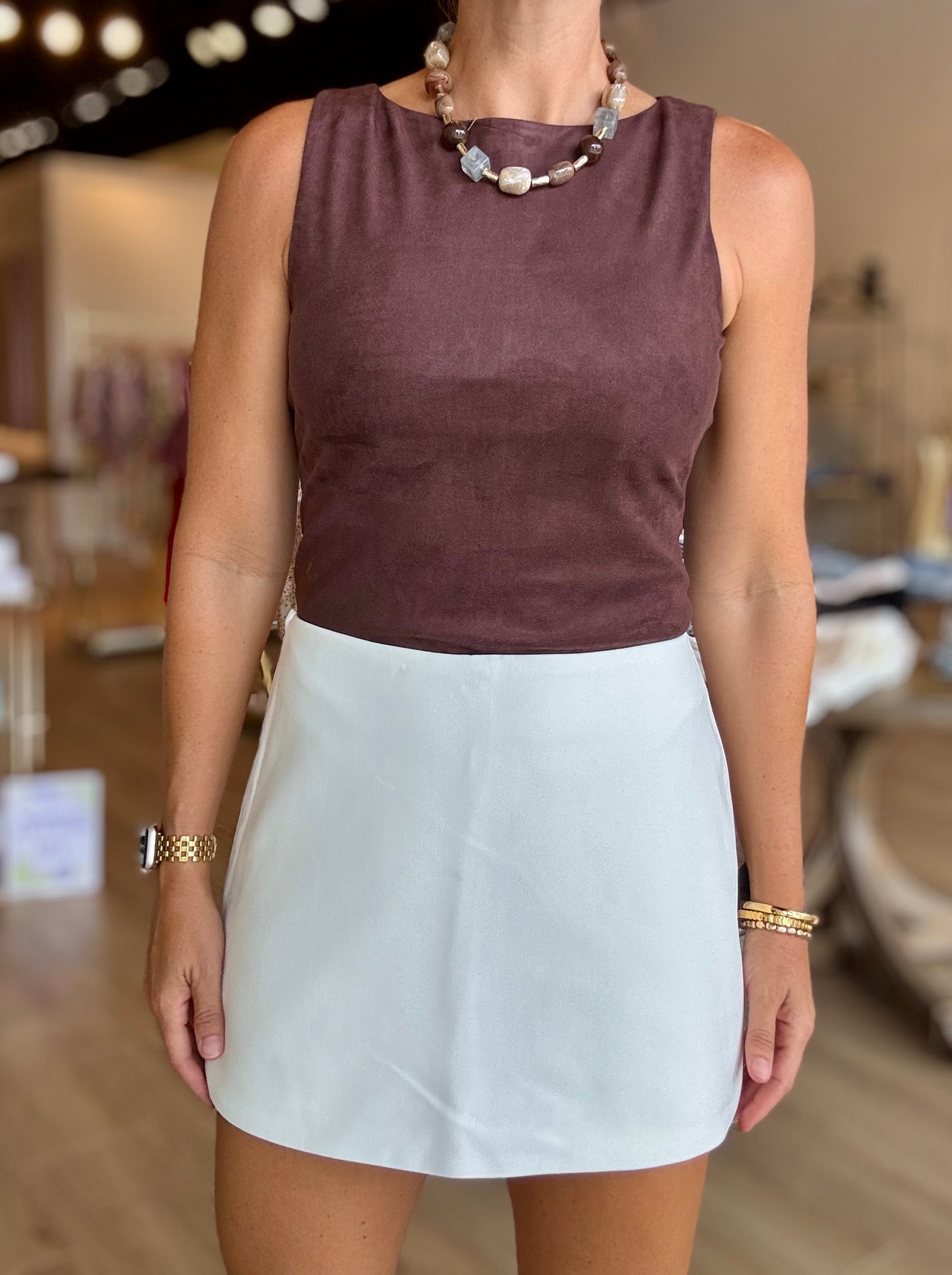 Steve Madden faux suede high neck bodysuit in a pretty chocolate hue perfect to bring into Fall