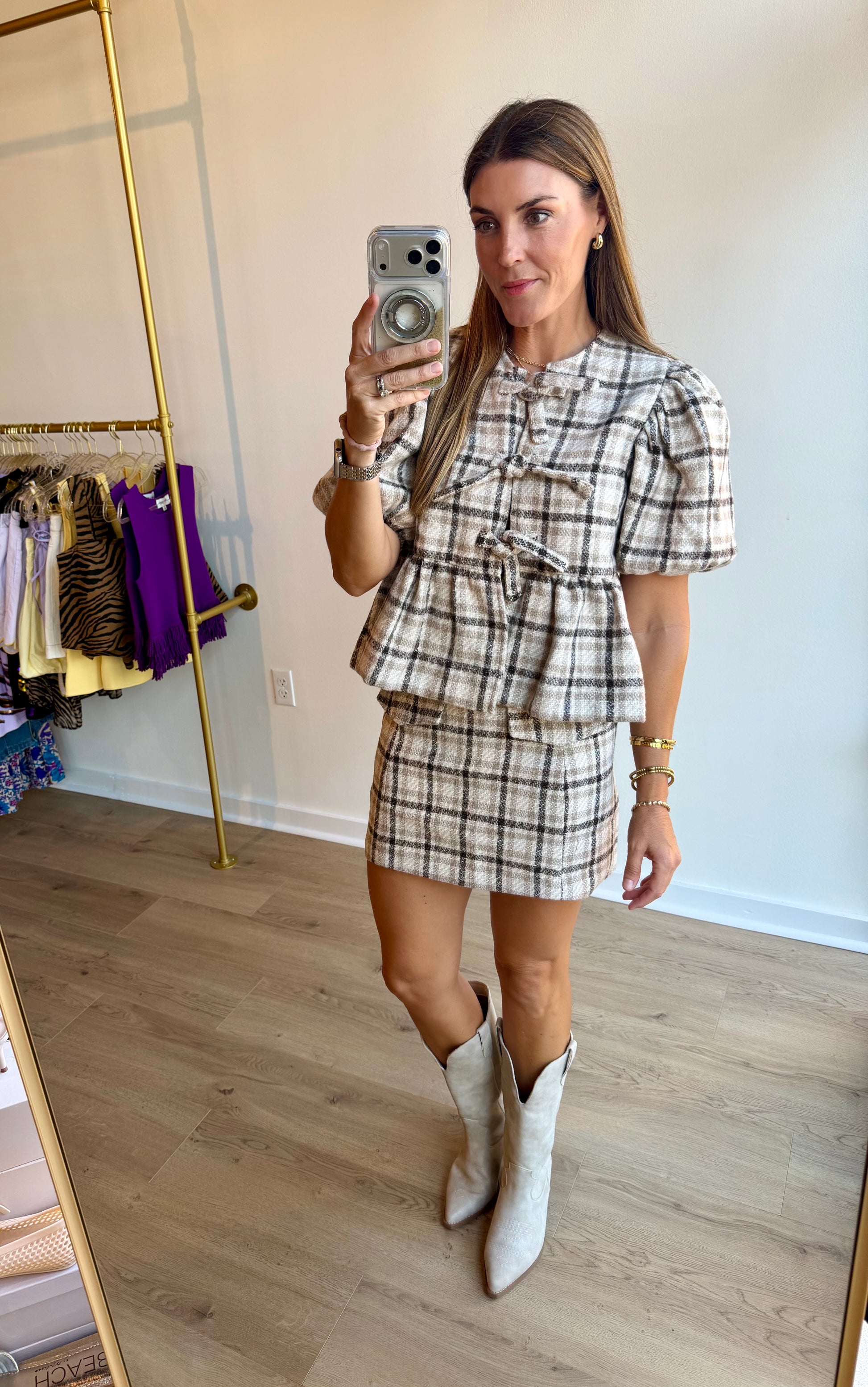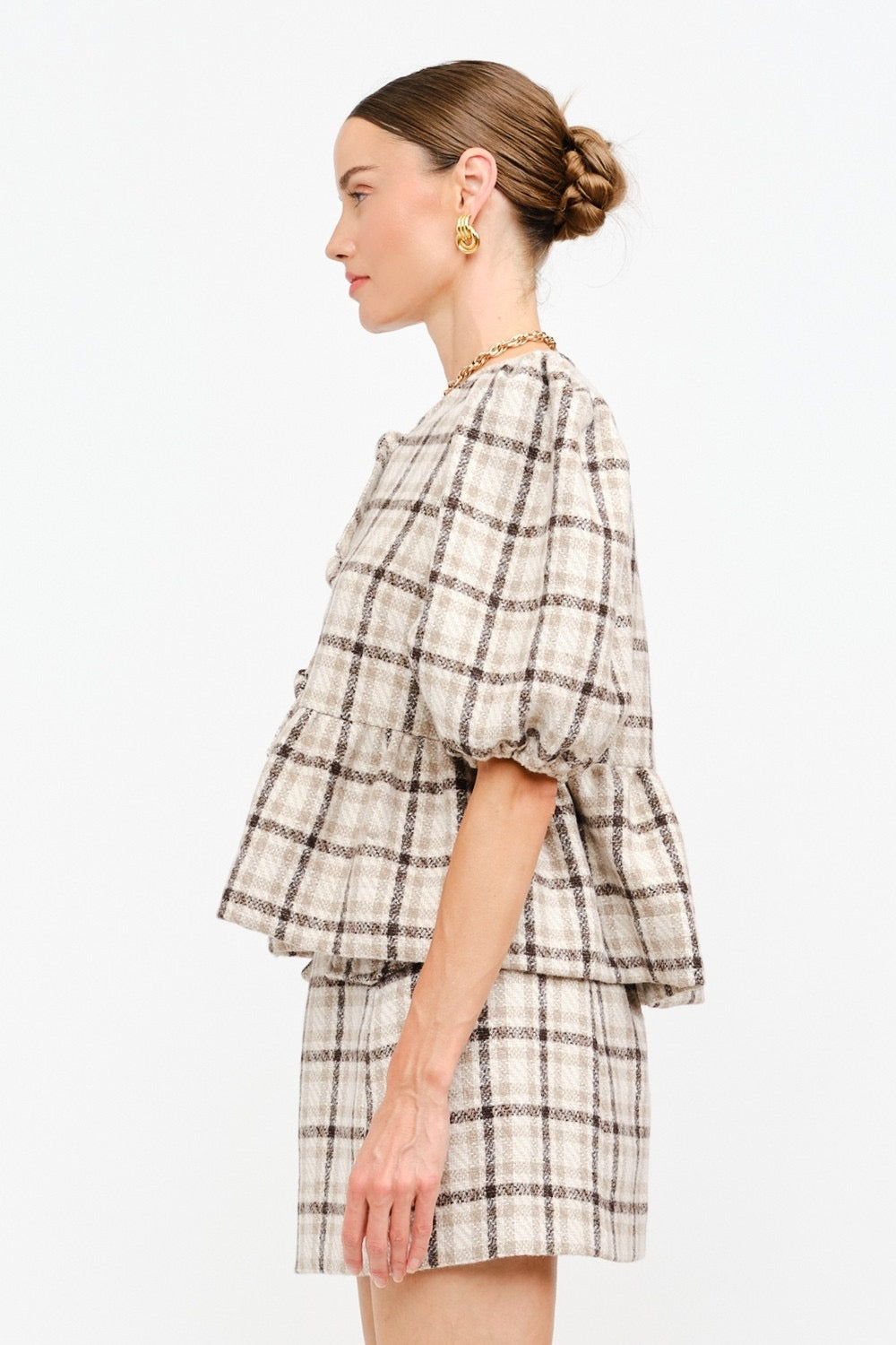 Wool-blend plaid blouse with puff sleeves and peplum hem, featuring three front tie closures for a feminine finish.