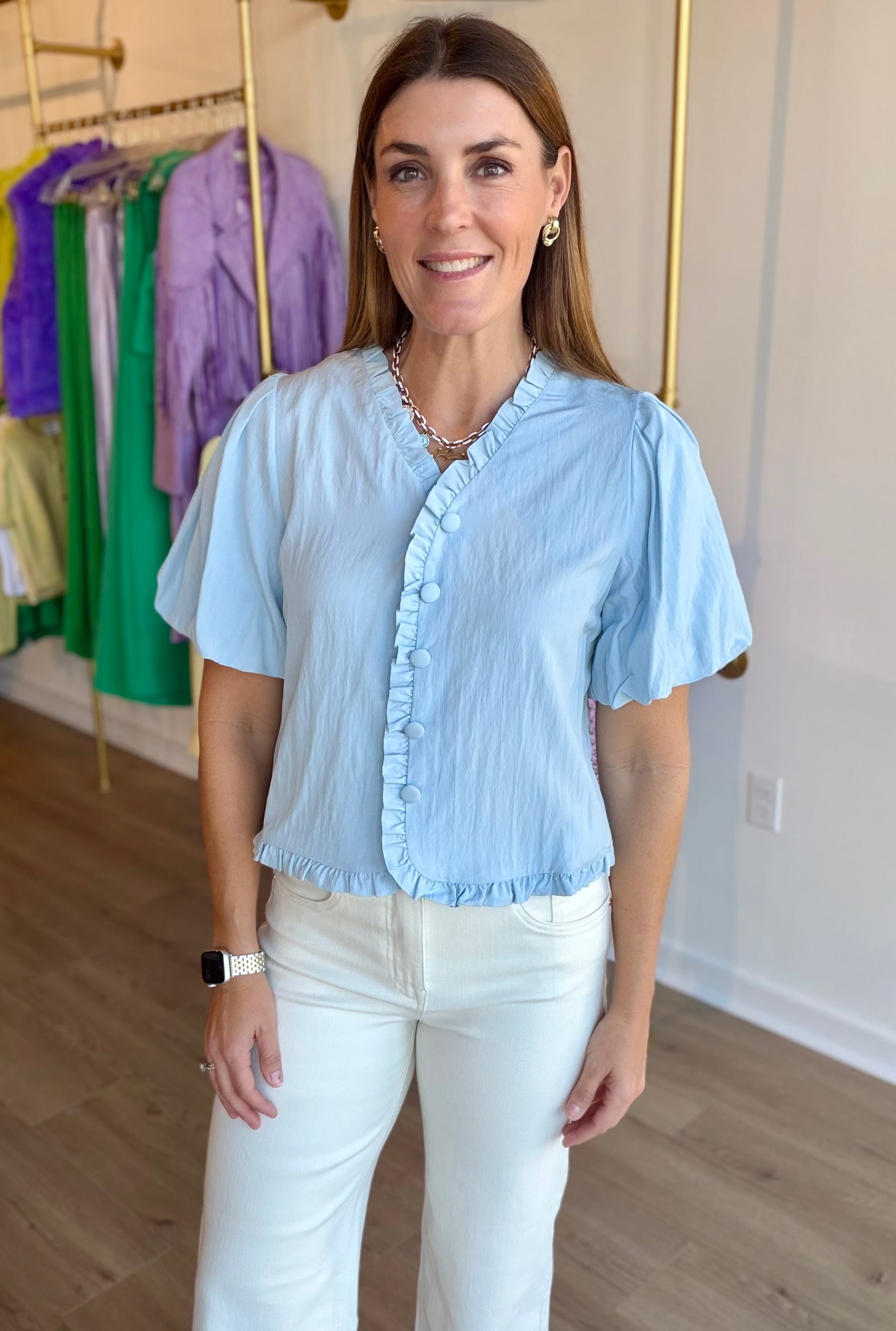 Women's Ruffle Detail Bubble Sleeve Top Lightweight, airy textured fabric with a soft feel. Ruffle detailing adds feminine dimension. Bubble sleeves create volume and movement. Faux button enclosure for a clean, polished look. Pair with tailored trousers for an elevated outfit or style with denim for effortless everyday charm. Fabric: Woven 75% Rayon 25% Nylon Hand Wash Cold