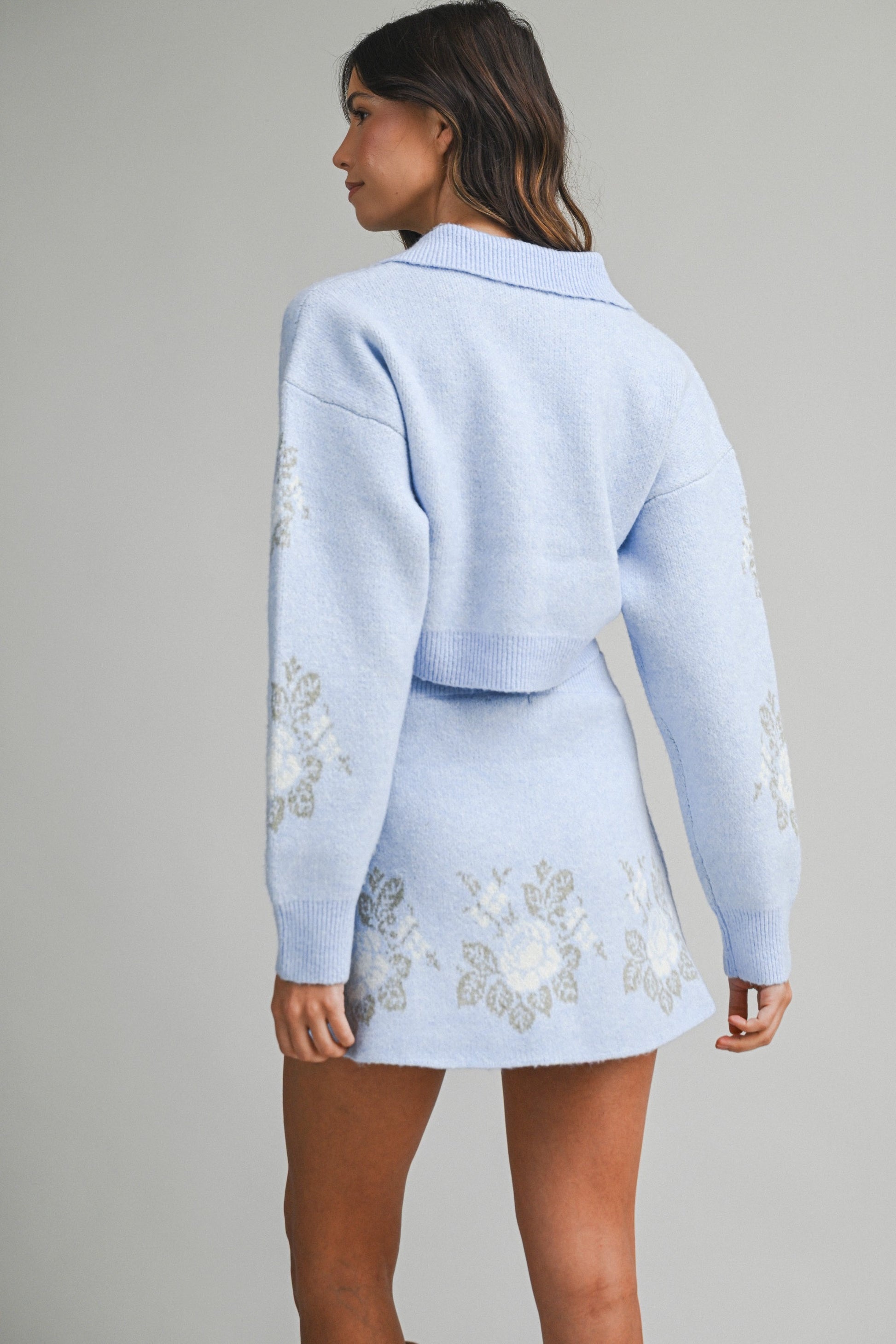 Sweater knit set with floral jacquard pattern. Cropped collared sweater with long sleeves and matching high-waisted mini skirt. Soft stretch knit.