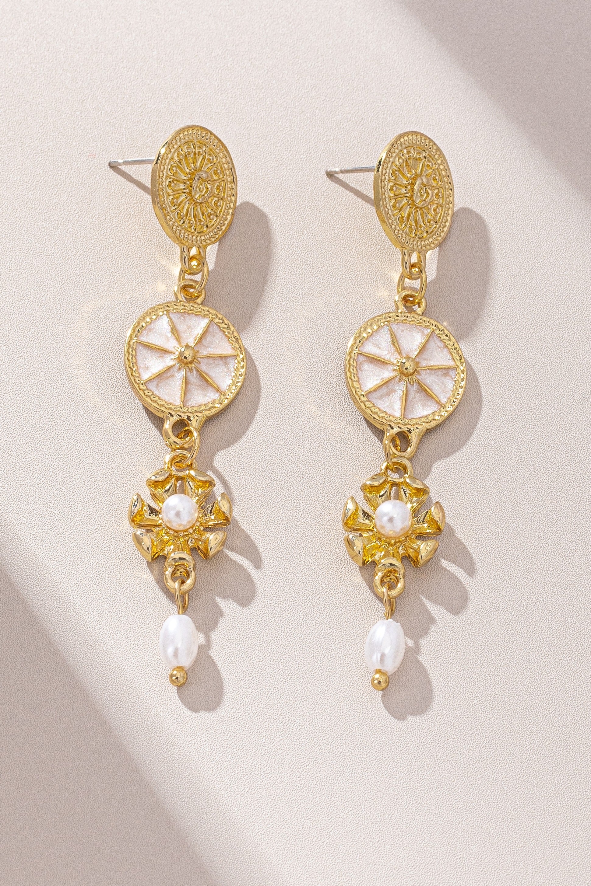 Gold Filigree Drop Earrings with Star Medallions, Flower Accents & Faux Pearls These vintage-inspired drop earrings feature layered gold-tone elements including textured filigree discs, white enamel star medallions, and delicate flower settings cradling faux pearls. Finished with a dangling pearl drop, this romantic design blends celestial charm with floral elegance-perfect for elevating both day and evening looks.