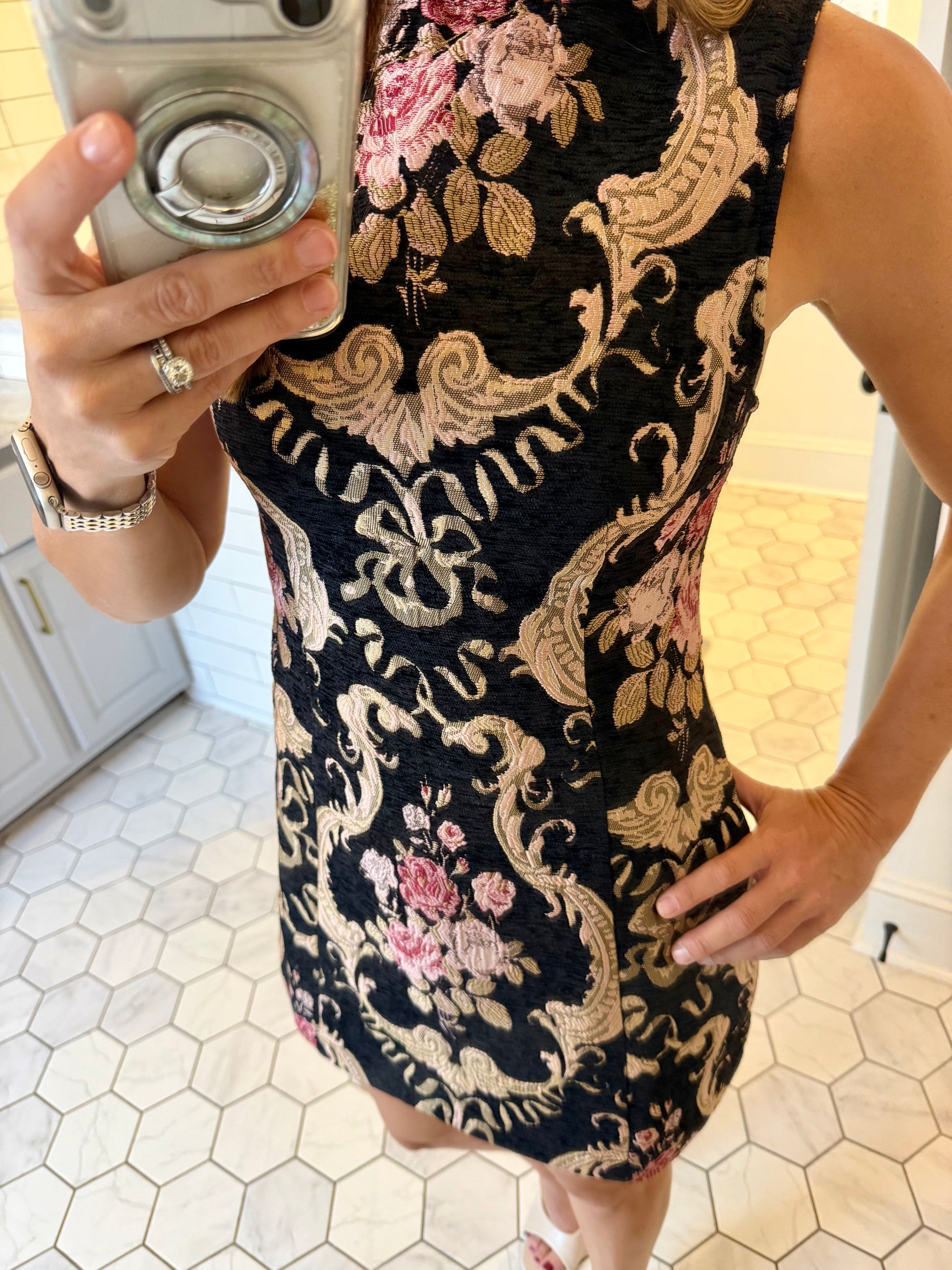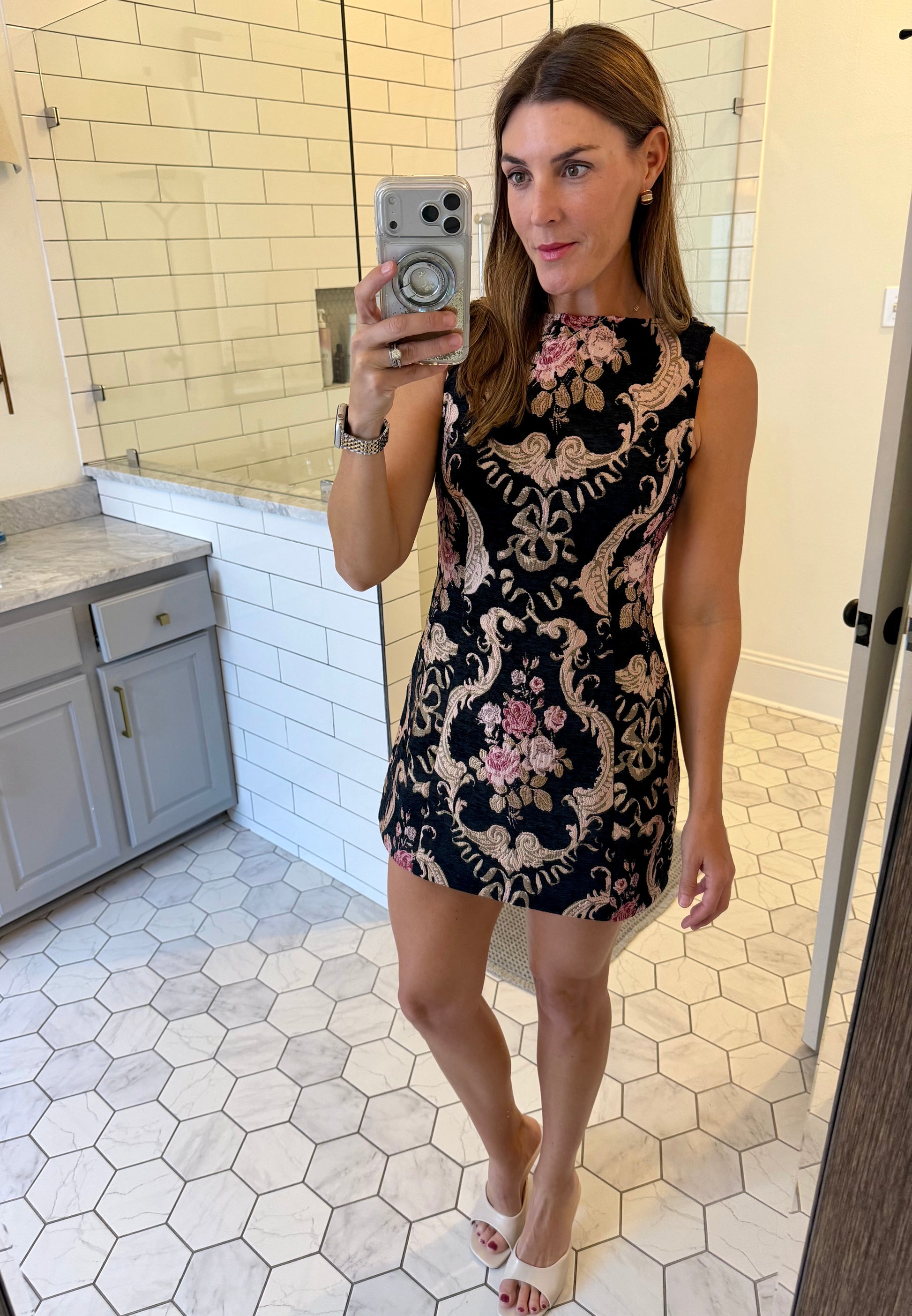 Jacquard Mini Dress In Floral Brocade: An ode to timeless elegance-this embroidered mini dress is a masterpiece in every stitch. Crafted in rich black with intricate floral embroidery in soft blush and gold tones, it creates a tapestry of romance and sophistication. - Black fabrication with ornate floral embroidery - Blush and gold detailing - Sleeveless, high neckline silhouette - Mini length, tailored fit - Back zip closure