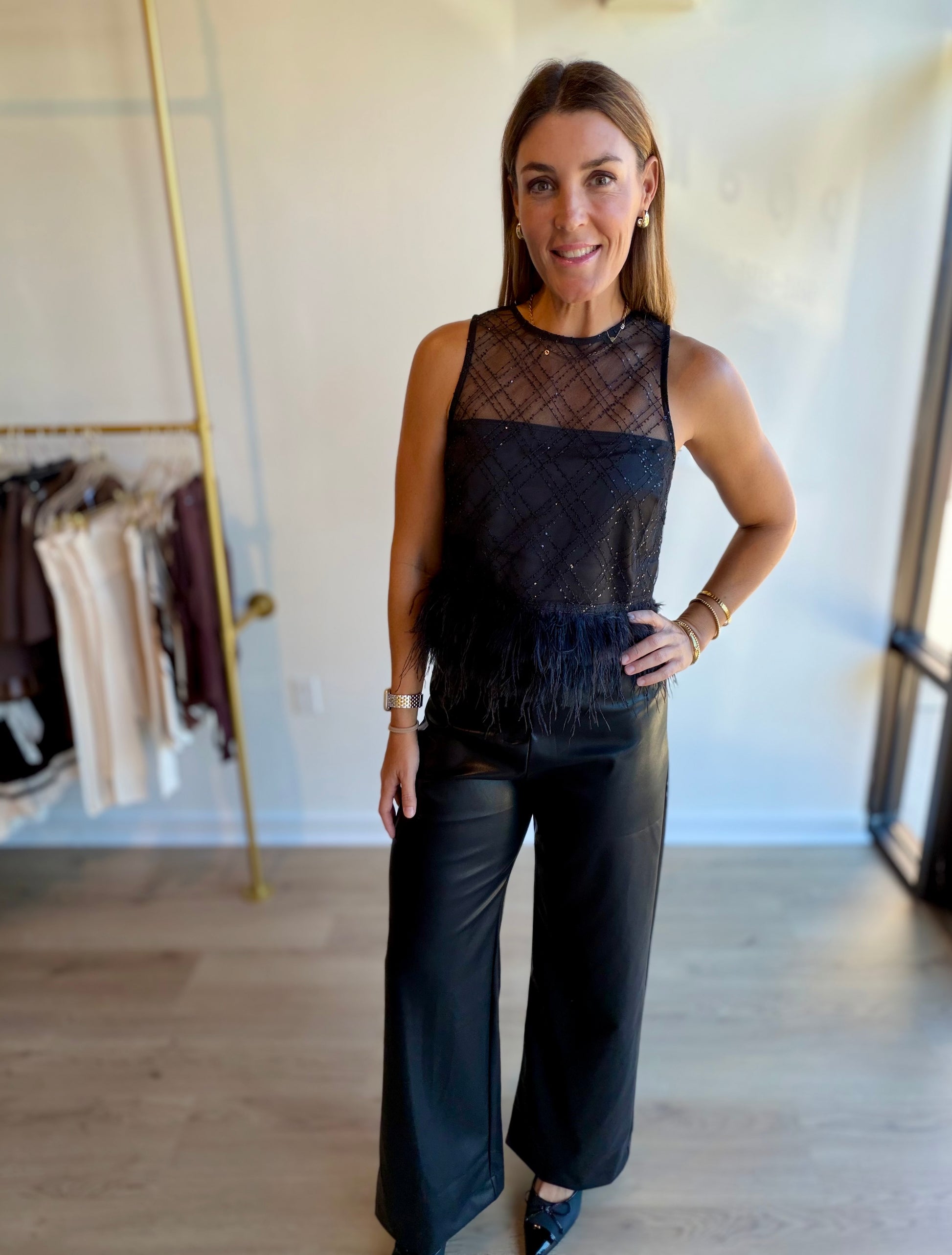 Elevate your wardrobe with the Lucy Paris Black Miley Feather Trim Top. This sleek sleeveless design highlights your silhouette while the luxurious feather trim adds a touch of bold elegance. Perfect for making a statement at evening events or stylish nights out, it combines comfort with standout style effortlessly.
