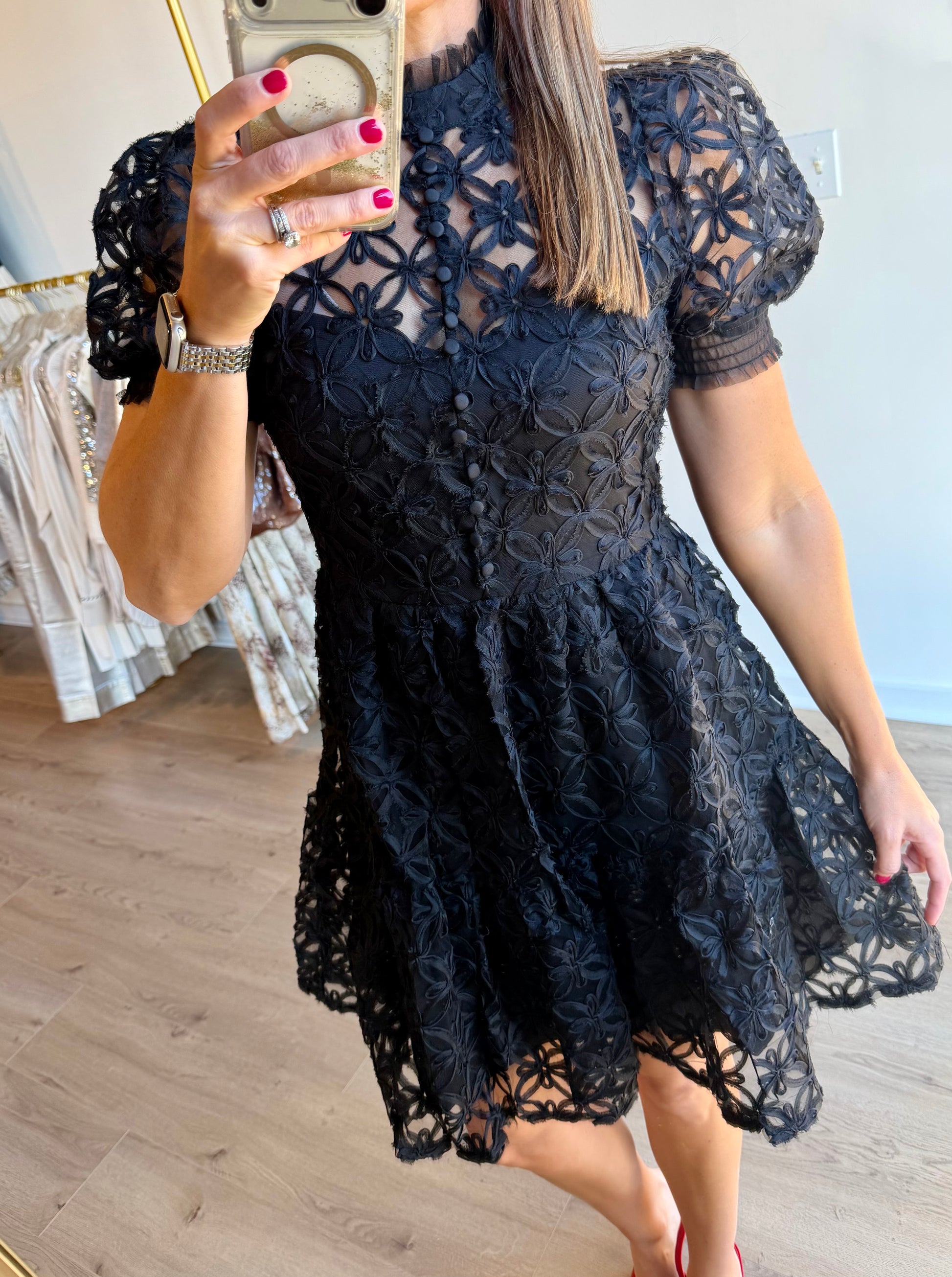 Pretty LBD in an organza detailed dress with puff sleeves and button details