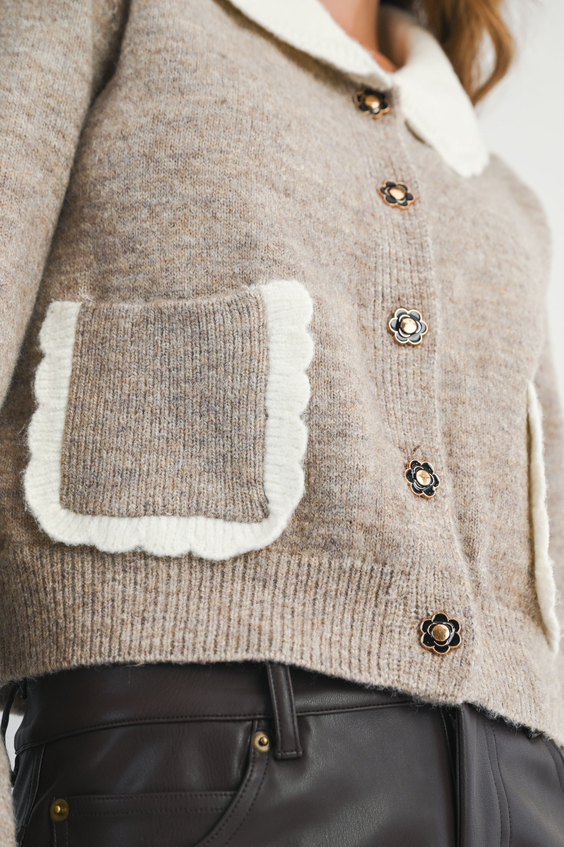Knit cardigan with contrast peter pan collar, flower buttons, front contrast scallop patch pockets.