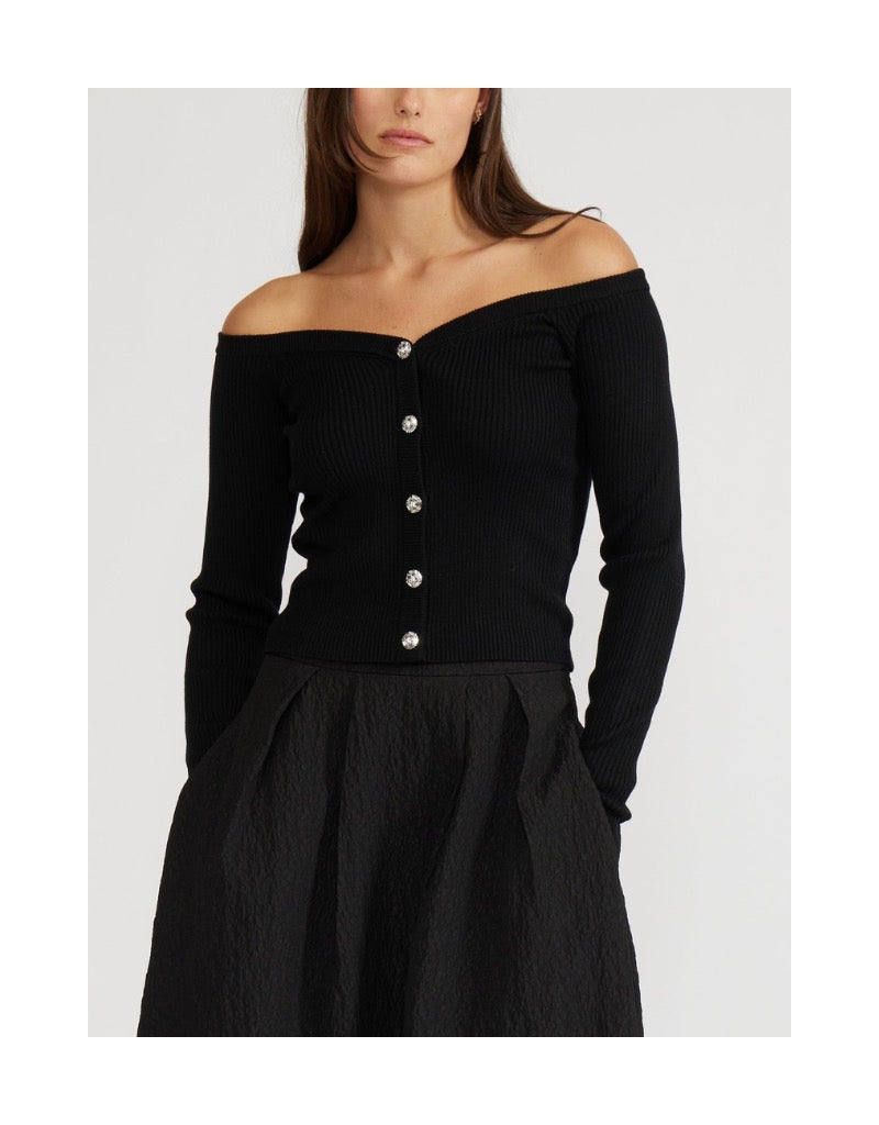 The Scout Top is a long sleeve, off the shoulder ribbed knit. Featuring crystal buttons, this top is sure to be one of your favorites.