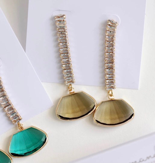 These exquisite 2.5" drop Fall statement earrings feature a delicate string of interlocking rhinestones leading to a rich faux brown gemstone. The delicate sway of these earrings adds a touch of glamour and sophistication to any ensemble, making them a perfect