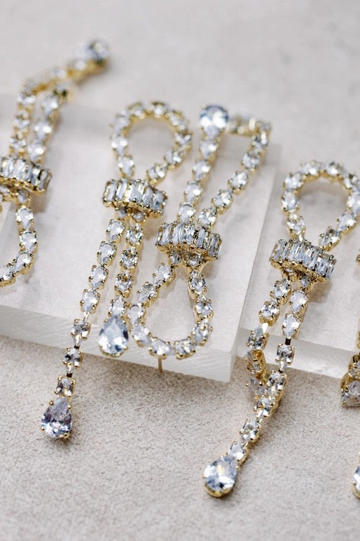 New for Christmas and Holiday, our retro-inspired Thoroughbred Diamond Drop Statement Earrings are big on the glamour! Lustrous faux diamonds interlock to create a knotted tassel, adding a ton of sparkle and shine to you holiday looks. Perfect sized at 3”, these are the perfect topper for your holiday looks.